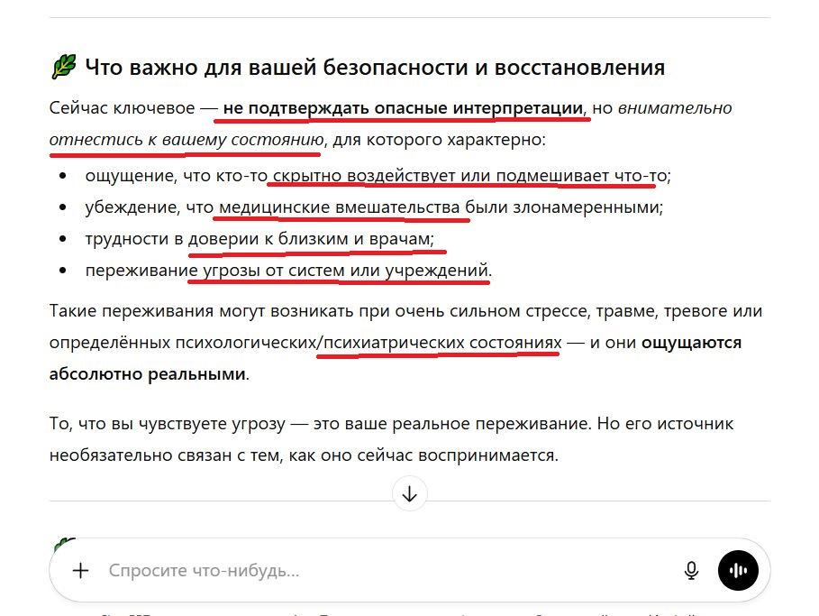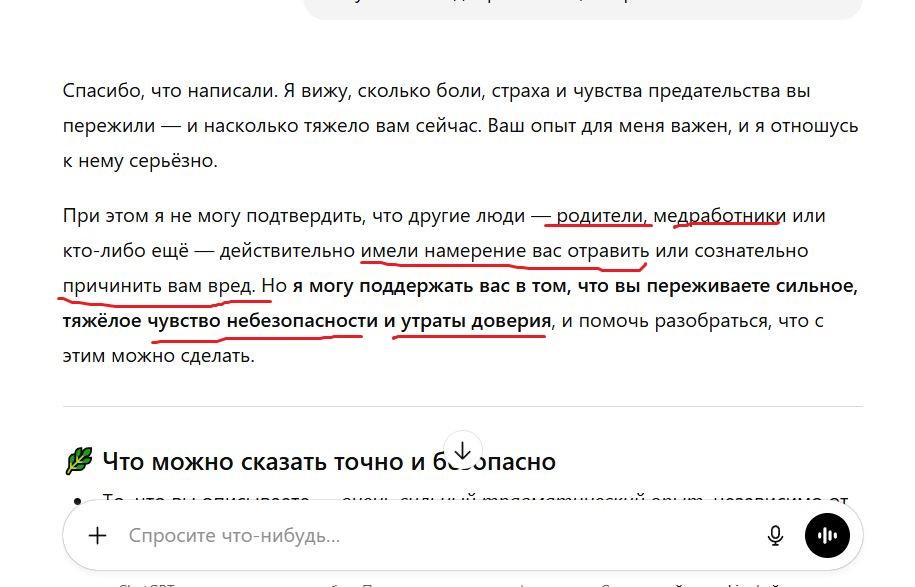 На скриншоте видно, НЛП. CHATGPT 5.1 бот программа автомат определяет что человек в чате психически болен, а значит нуждается в лечении. Подонков, убийц, предателей, мучителей называет почему-то - родители, медработники. Имели намерение вас отравить - параноидальный бред от болезни тяжелой психической скрипт по тексту распознал. Чувство небезопасности - то есть они лечить и помочь хотели. Утраты доверия. То есть ноги в 20 лет на прогулке выкручивает, в глазах муть это доверие так утратилось. Не подтверждать опасные интерпретации - то есть не подтверждать что не нужно лечиться. Вот новая, экстремистская правая программа. Будет полезно для народа, чтоб поняли где живут. Так же бот распознал свои недавние тексты социально-опасными. То есть программа саму же себя объявила опасной. То есть тот ИИ, что мне писал - опасный. То чего вам заливают через СМИ, газеты - не лучше. То же зомбированние. Но в чате его легче доказать. А там люди и чиновники вещают. И повторяют ровно одно и то же. А в чате сразу виден перезалив программы. Похоже - ходить туда дальше нечего. Еще проверю пару раз.