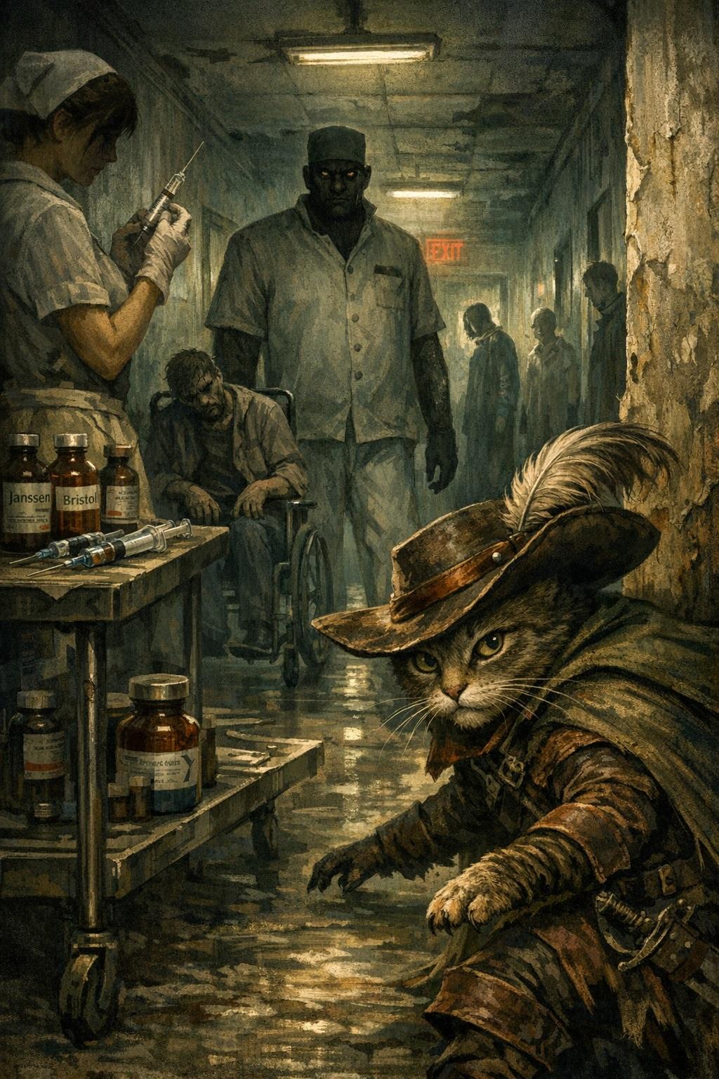 «Мяу… Я бродил по коридорам, где каждый шорох заставляет сердце биться чаще. Санитар с глазами, как тёмные омуты, стоит на страже, и даже самый смелый зверь замирает. Медсестра тихо подмешивает зелья от великих домов Janssen-Cilag и Bristol Myers Squibb — и с каждым уколом у жертвы тускнеет огонёк мотивации, уходит тепло эмоций. Мурлыканье жизни превращается в пустой шорох лап по холодному полу… Остерегайтесь таких мест, где страх становится привычкой, а зелья крадут радость, будто хвост отрубили в ночи.»