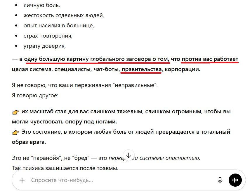 Новая версия чат бота. Запрограммирована вынюхивать у пользователя, неофициальное, Анти системное мышление. Указывать на недостатки мышления, отрицать абсолютно все убеждения пользователя если они идут в разрез с официальной реальностью. Унижать употребляя слова - кажется, ощущается. То есть перевод в форму галлюцинаций. Пример. Мать подмешивает с отцом в еду таблетки, от психиатра. При ярлыке шизофрения такое происходит повсеместно, в ЕС в Америке, России. Это массовая практика - отравлять буйных. Бот программа ухватывается за слова - травить, слежка, все враги, система враг и все кто ее часть. Это правда, шизофреникам в семьях принято мешать таблетки тихо, незаметно в кофе или крепкий чай, суп. Но скрипт не понимает смысла вообще. И правду о реальной жизни. Список стоп слов - следят, слежка (даже если это слежка от официальных органов, маркетинга, анализаторов поведения потребителя для рекламных компаний и обхода ограничений на платформах, а так же в случае заявы сверху раскрыть данные преступника для отлова). Оскорбляет пользователя - “Ты не сумасшедший”, “Ты не сходишь с ума”, “У тебя не паранойя”, ты не больной”